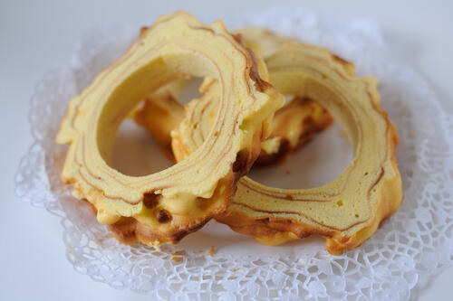 バームクーヘンをドイツ語で「木のケーキ」という意味を持つ。バームクーヘンの層が木の年輪に見立てられて名付けられたようだ。