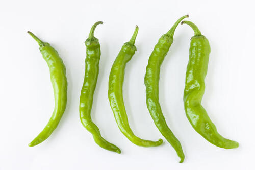 細長い形状から、ひもとうがらしは「水引きとうがらし」の別名を持つ。鉛筆よりも細身である見ためが、ひもとうがらしの最大の特徴といえるだろう。太さは約5mm、長さは約10cmに成長する。濃い緑色にはつやがあり、ししとうを想起させる形状にもかかわらず苦みや辛味が少ないことで知られている。