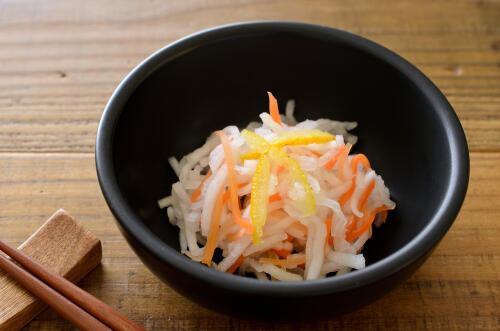 天日干しが面倒な場合の作り方も紹介しよう。まず大根を拍子切りにし、塩をまぶして10分ほどおく。次に酢と砂糖をあわせ甘酢を作る。続けて大根の塩気を水で洗い流し、水気をよく絞りボウルに入れ、甘酢と刻んだ柚子を加える。あとは半日ほど漬け込んだらOK。1週間くらいは日持ちするようだ。