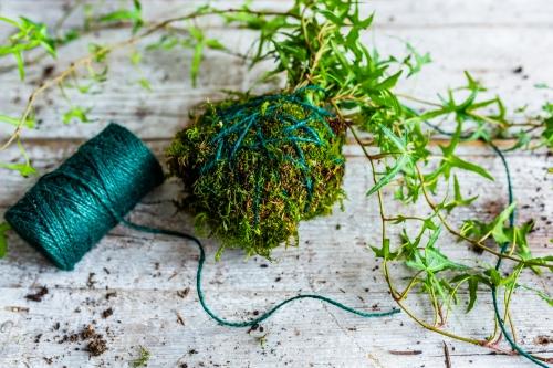 事前に洗って軽く水気を切った苔を、土を隠すように土玉に丁寧に貼りつけていく。そのままでは苔が剝がれてしまうので、苔のまわりに木綿糸を巻き、固定しながら作業しよう。ここが苔玉の作り方の中で1番重要な作業だ。巻き終わったら木綿糸を結んで、結び目を土の中に隠し、お皿などに飾れば完成だ。