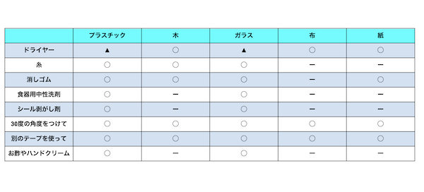 いろいろな両面テープの剥がし方を紹介したが、いずれも被着体がどのような素材であるかが重要になる。簡単にまとめたので、こちらもぜひ確認していただきたい。