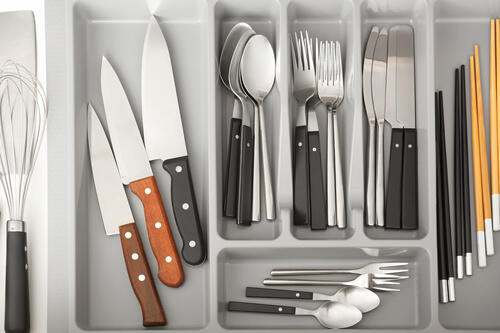 引き出しをカトラリー専用にすれば、アイテム数が多くても使いやすく整理できるだろう。伸縮したり仕切りが動かせたりする商品なら、引き出しや収納するカトラリーに合わせて調整できる。