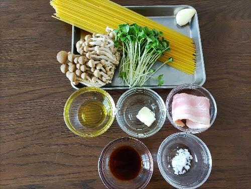 火にかけたフライパンに投入。バター、めんつゆを加えて、全体に絡むように混ぜる。味が調ったら火を止めて皿に盛る。パスタが茹で上がったら、再度パスタを皿に盛り付けたら、かいわれをこんもりと上にもり完成。