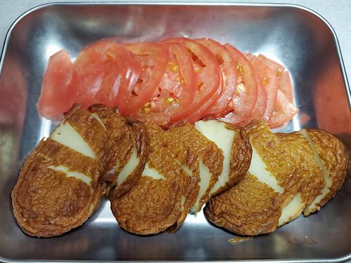 トマトは洗って、余分な水分を除いてから薄切りにする。さつま揚げは、熱湯をかけて油抜きをし、5等分になるように薄切りにする。ここでしっかり油抜きをすることで、ハーブオイルが生きてくる。