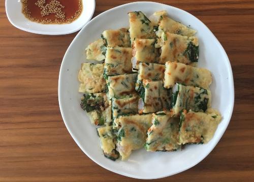 今回は26cmのフライパンで2回に分けて焼いた。薄く焼くとカリっと仕上がり、生地に厚みをもたせるともっちりとした食べ応えのあるチヂミが焼けるだろう。