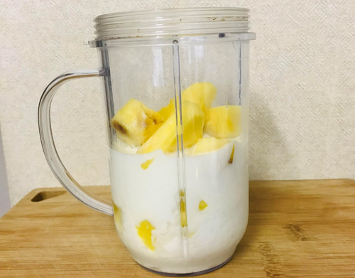 ミキサーに氷以外を入れ、パイナップルが細かくなるまで混ぜる。