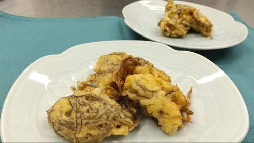 揚げ油を160℃くらいに熱し、衣を2本のスプーンですくって油の中に入れる。こうすることで、丁度よい大きさの天ぷらに仕上がる。