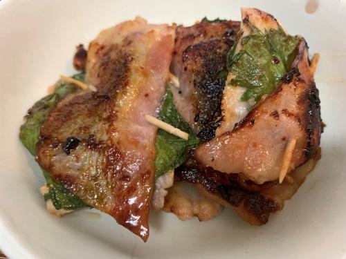 ベーコンは最初から切れているもの(いわゆる切り落とし)もあるが、大きさが揃っていないと今回は使いにくい。長いものなら、1枚を3等分し、大葉の上にのせて爪楊枝で止めておく。