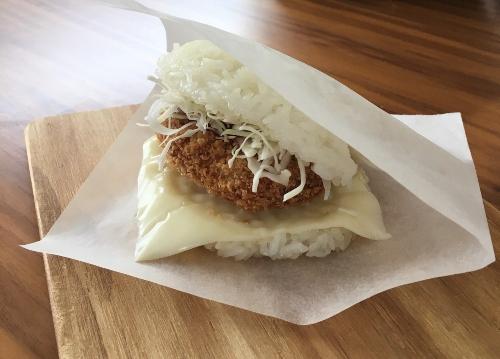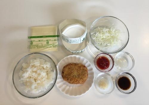 フライパンから取り出したごはんの上に、スライスチーズ、コロッケ、ソース、千切りキャベツを順にのせ、最後にごはんで挟む。