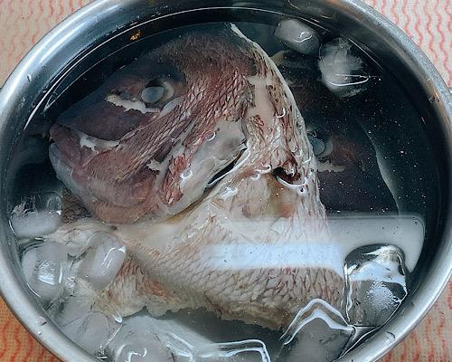 鯛のアラに分量外の塩をふりかけて、5分程度置く。湯を沸かし、鯛のアラをさっとくぐらせて霜降り状にしてから、冷水につける。そのまま、鱗や汚れなどをしっかりと落としておく。