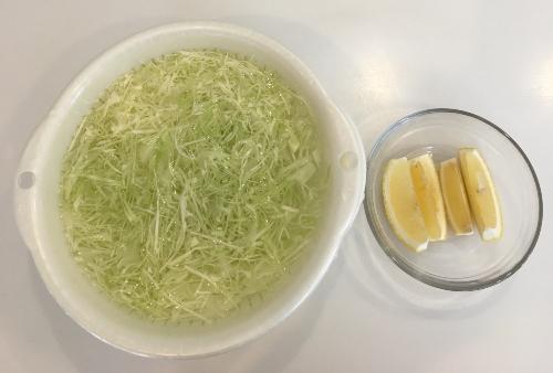 キャベツは千切りにして、水にさらしておく。レモンはくし切りにする。