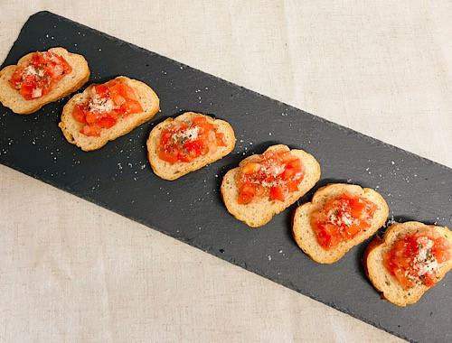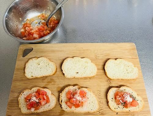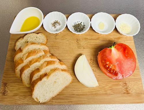 オリーブオイル、にんにくチューブ、塩、黒こしょう、乾燥パセリを混ぜる。みじん切りにしたトマトと玉ねぎを加えて和える。