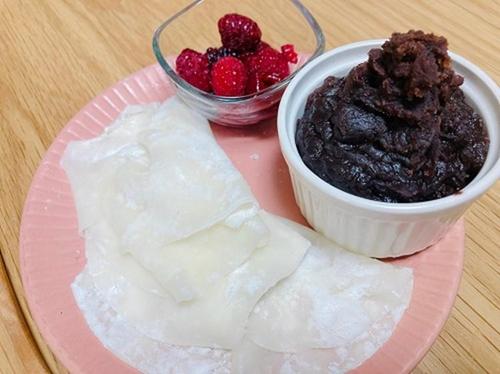 お皿に盛り付ける。フルーツとあんこを餃子の皮に乗せて、手で巻いて食べる。