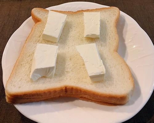 半分にカットしたクリームチーズを、食パンの4箇所にのせる。